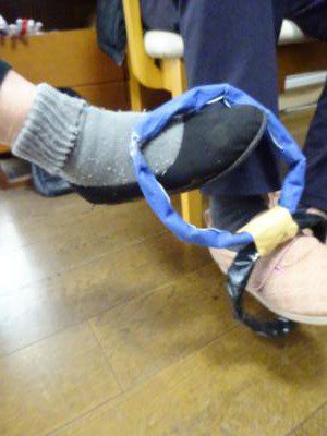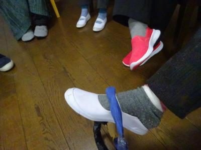 うちわを使って、ツルッツルの積み木を隣の方のうちわに