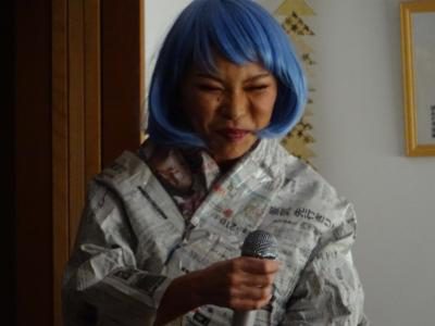 「今日は望みの幸望庵の大忘年会に営業に来るため新聞紙で着物をこさえてきました~