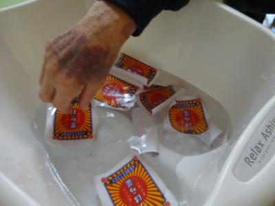 コピー用紙に透明テープを貼ったら水に浸して剥がします