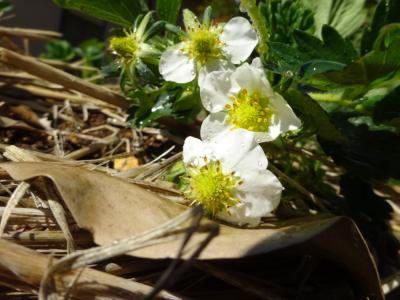 イチゴの花も咲き・・・初イチゴ 楽しみです