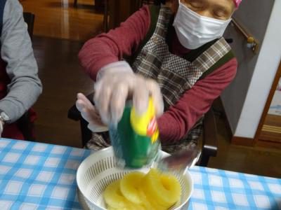 まずはパイナップルをザルにあけて。。