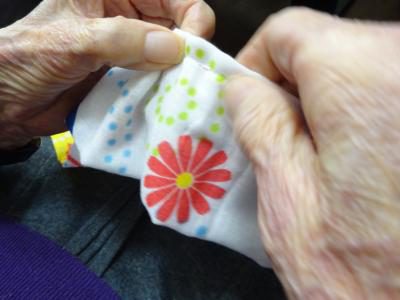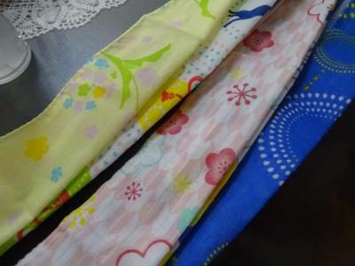 手ぬぐいタオルで首に巻く保冷剤入れを縫っています手 (チョキ)手 (チョキ)