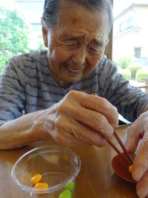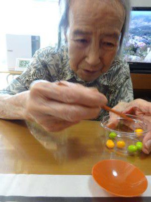 おまめさんをお箸で取って指先・脳トレーニングです左斜め上左斜め上