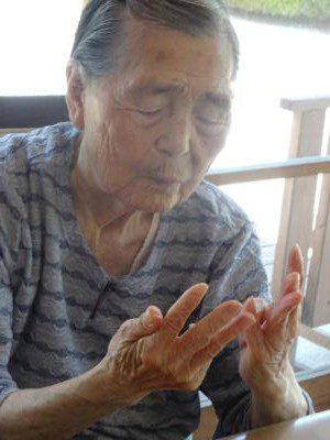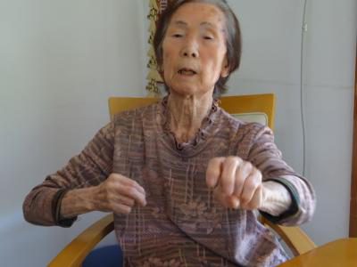 今度は、座って指体操していきましょう手 (グー)手 (チョキ)手 (パー)