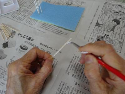 塗った楊枝も渇いてきたので、台紙に刺していってみましょうか