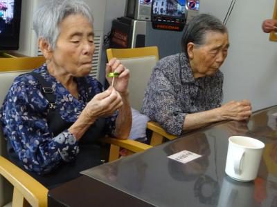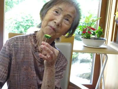 お茶飲んで、きゅうり食べた後は体操しましょうわーい (嬉しい顔)