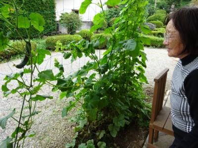 キュウリさんの成長具合を確かめに、一緒にお庭へウッシッシ (顔)