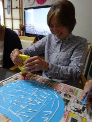 そして、切った型紙にボンドを付けていきます手 (パー)