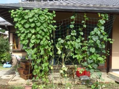 朝顔・甜瓜・キュウリの順番に緑のカーテンになっておりますわーい (嬉しい顔)