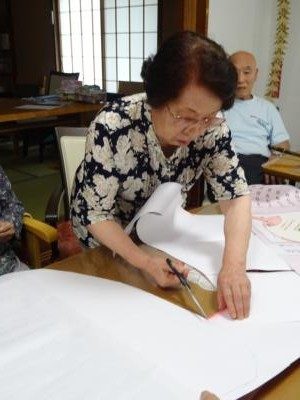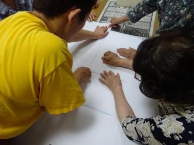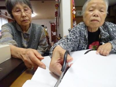 お母さんたち紙を貼り合わせて大きな紙を2枚作っていまするんるん (音符)るんるん (音符)