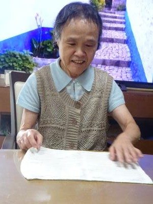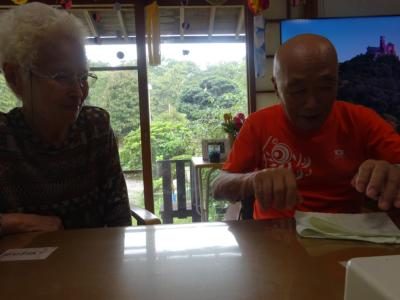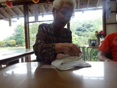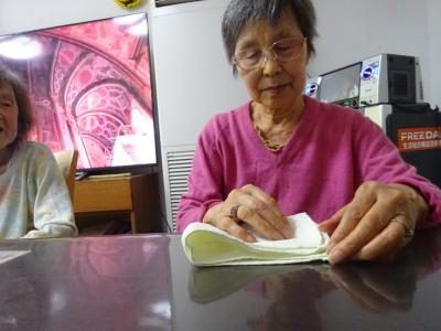 指先を使っておしぼりたたみで脳トレーニングですわーい (嬉しい顔)