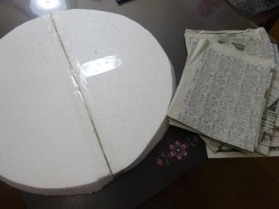 ↑↓丸めた新聞紙がある程度作れたら、今度はそれを土台に張っていきます