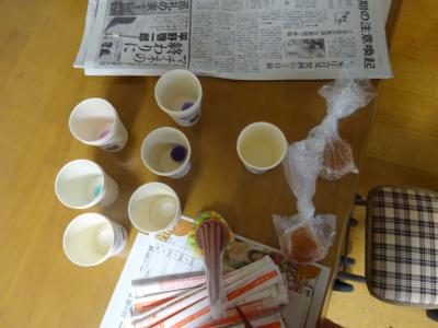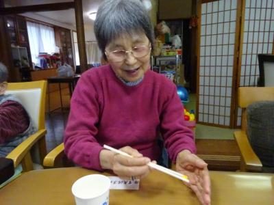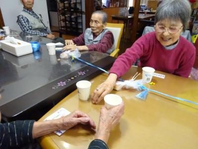 カップの中に豆をお箸で掴んで入れてくのは指先の