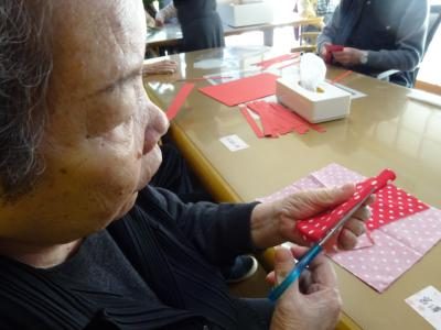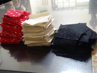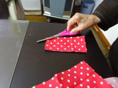 クリスマスチックな赤の水玉模様小さめな四角に切っていきます