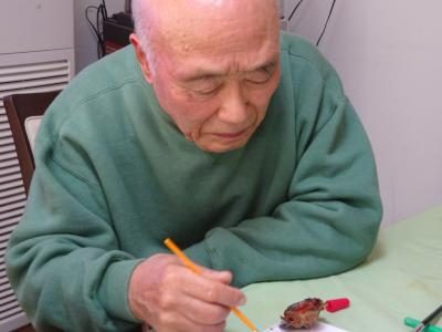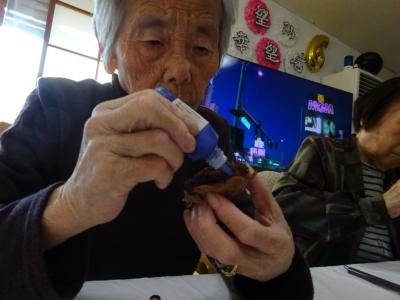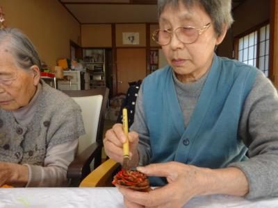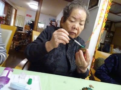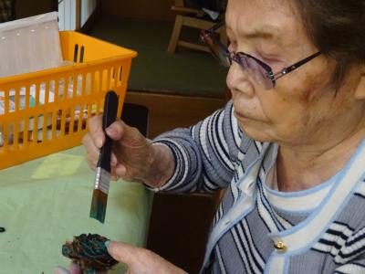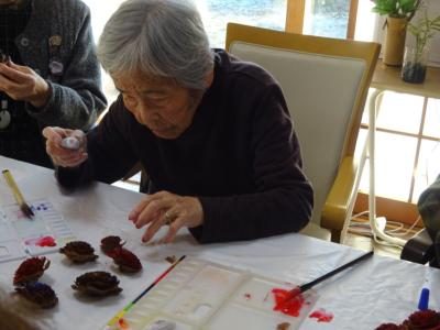 お母さん、鼻歌を歌いながら松ぼっくりに色付けを
