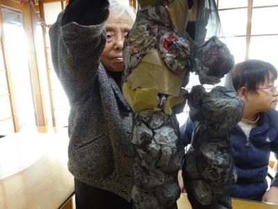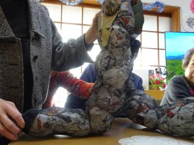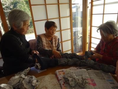 ストッキングに丸めた新聞を詰めていきます