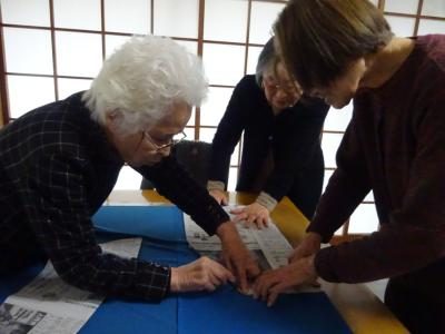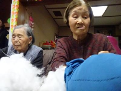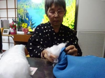 お母様方は、裁断した布を縫って頂いてその中に綿を詰めて