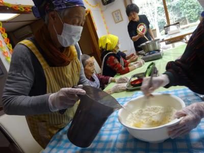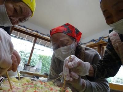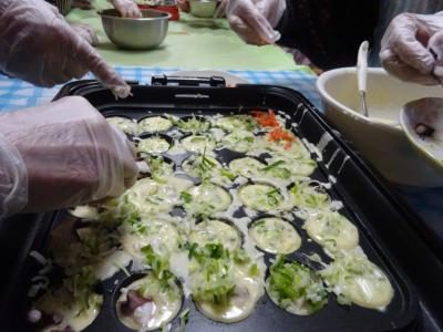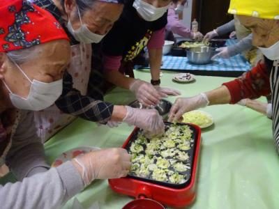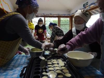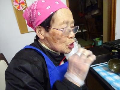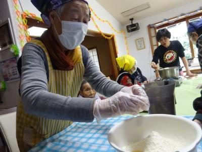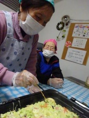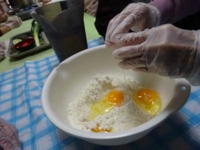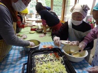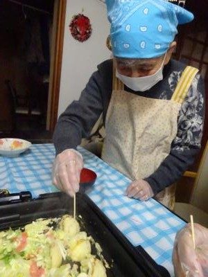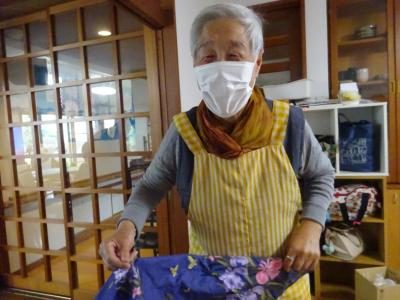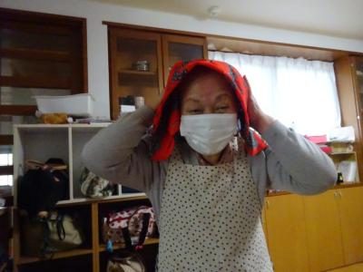 手洗いをし・・・エプロン、三角巾、手袋、マスクを装着