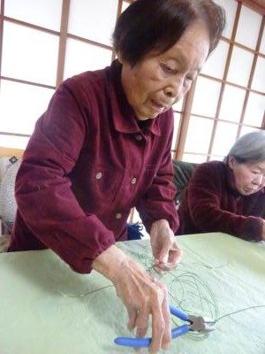 先程のお母さんが切ったワイヤーを違うお母さんが形にして、メガホンに巻き付けていきます台風