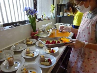 スタッフの手作りお菓子とフルーツを綺麗にデコレーションるんるん (音符)