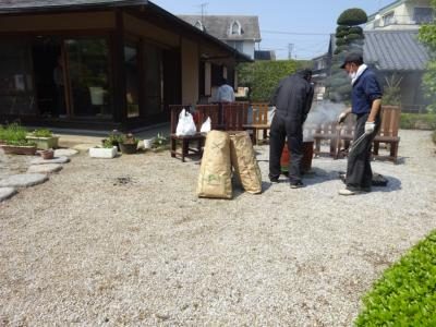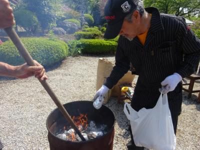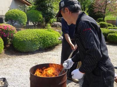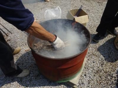 ドラム缶に枯葉や枯れ枝を入れ、火を起こして…