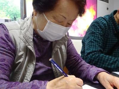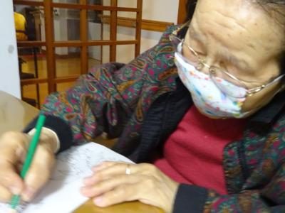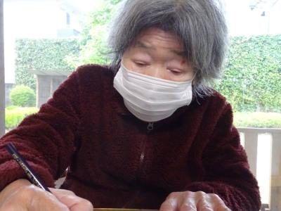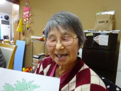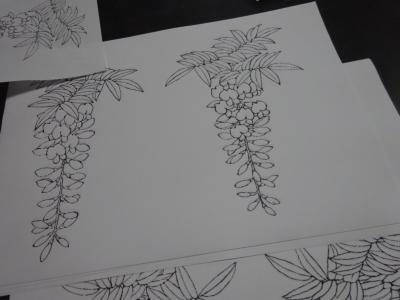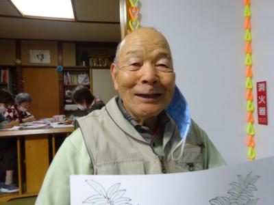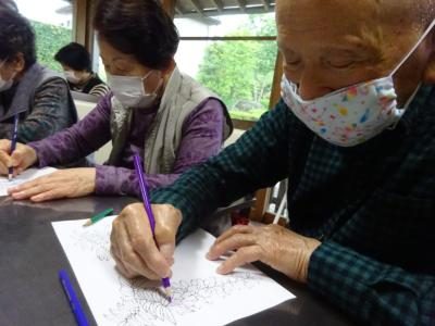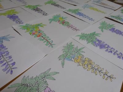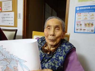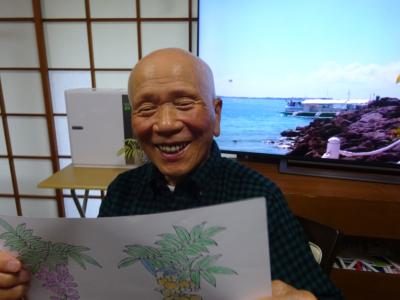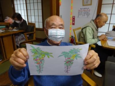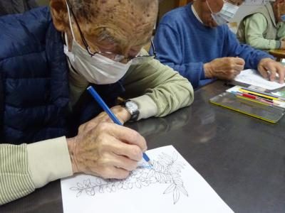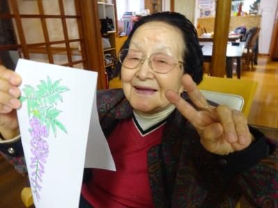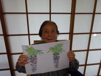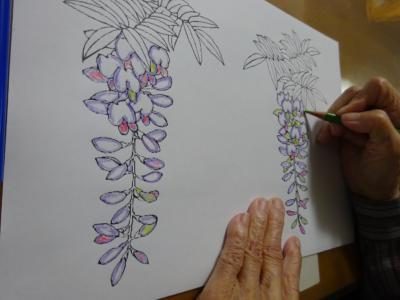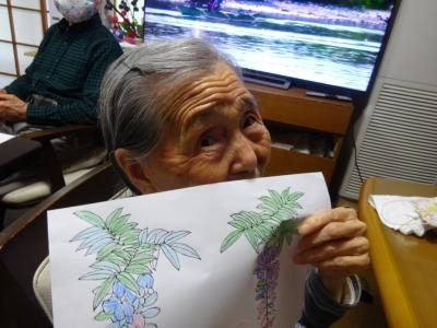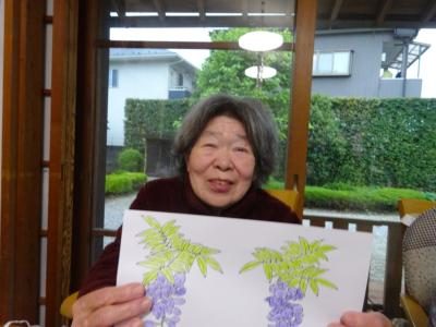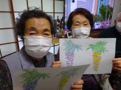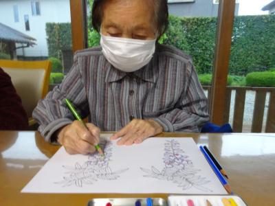 午後は、季節のお花「藤の花」の塗り絵をしましょうかと