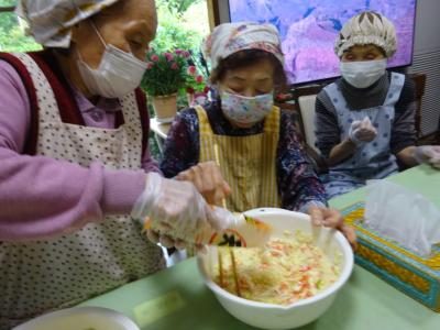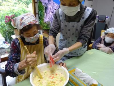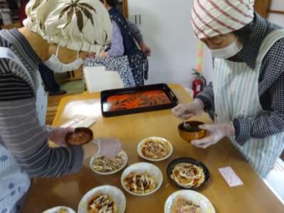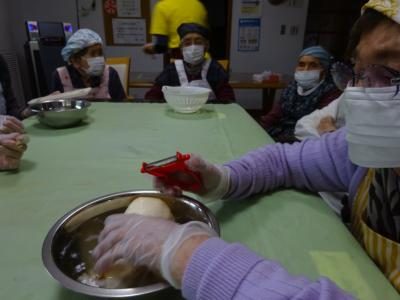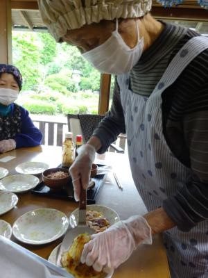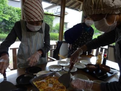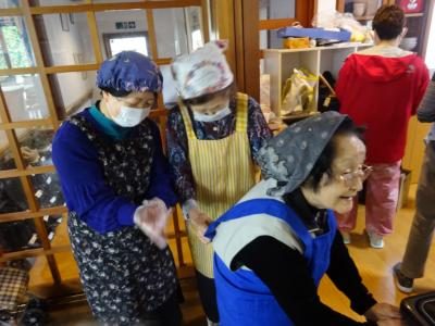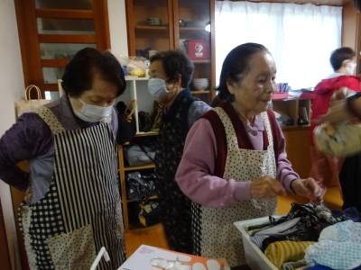 エプロン、三角巾、マスク、手袋を装着し・・・