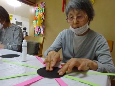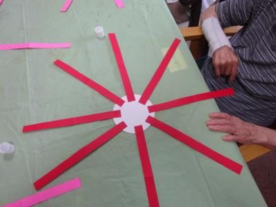 まずは、丸く切った画用紙に細長い画用紙を対角線上に8本貼り付けていきますひらめき