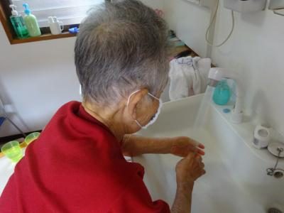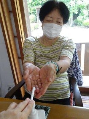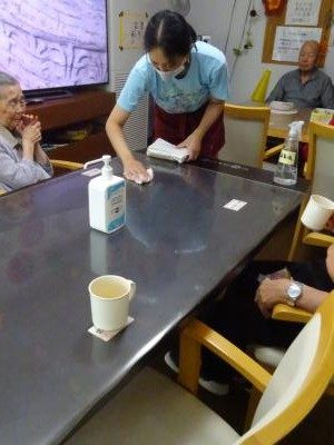 食事の前には、職員がテーブルの隅々まで消毒いたします(‘◇’)ゞ