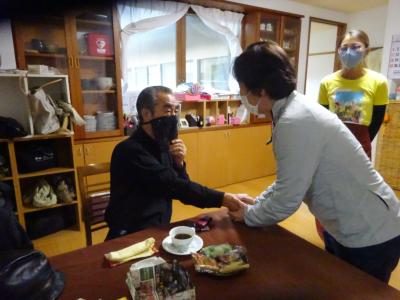 堀口オーナーが座った途端にお母様は握手でご挨拶