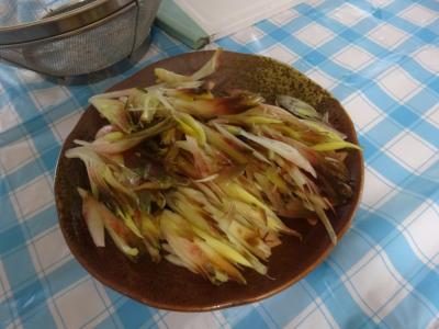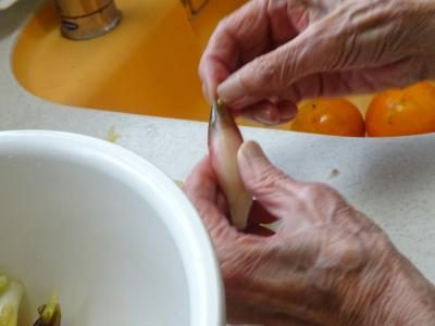朝採れのミョウガも丁寧に洗って、外側の硬い皮をむいていきます