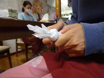 ティッシュを使い、何やら製作中