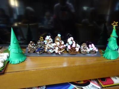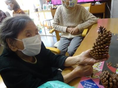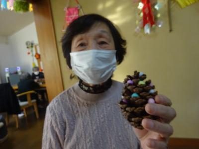 職員が拾ってきた大王松の松ぼっくりにも飾りつけいたします