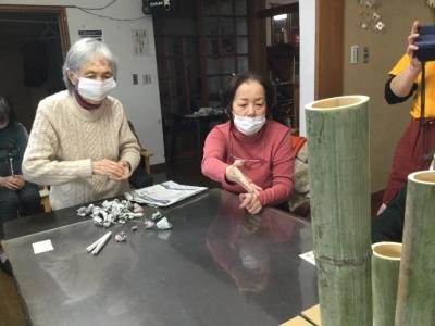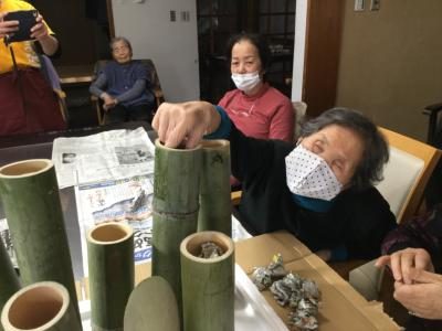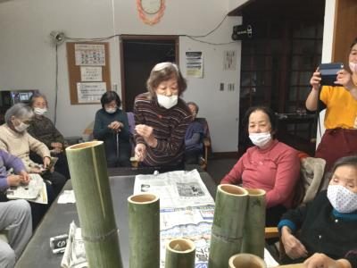 皆様中々新聞紙が入らずそれを見かねたお母さん竹筒の真上から入れていました