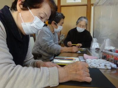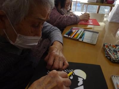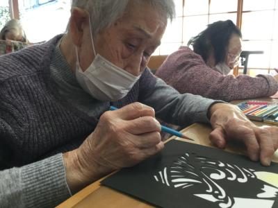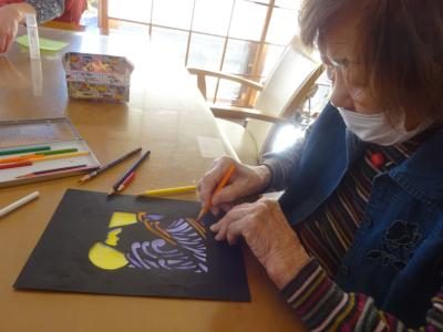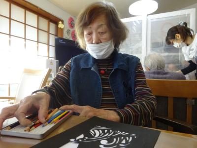 切り絵に色鉛筆を使って色入れをしていきますわーい (嬉しい顔)