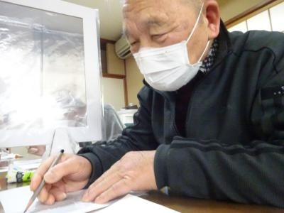 見本を見ながら几帳面な絵がお得意なお父様わーい (嬉しい顔)