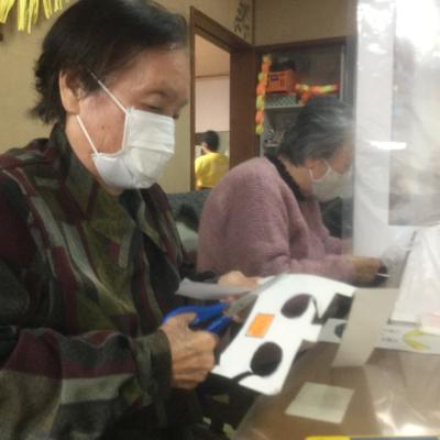 鬼の顔を塗っていただいた後に、切る作業もやって頂き