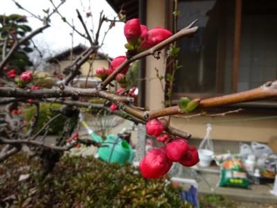窓からちょうど目の前の木瓜の花がこんなに膨らみ・・・