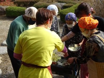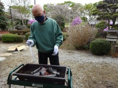 望みの幸望庵の庭にて、炭を使い火をおこします