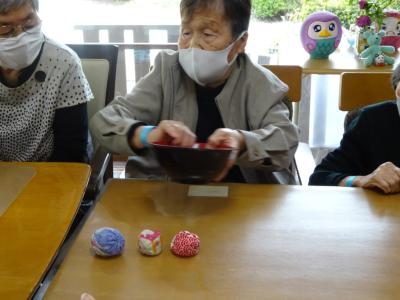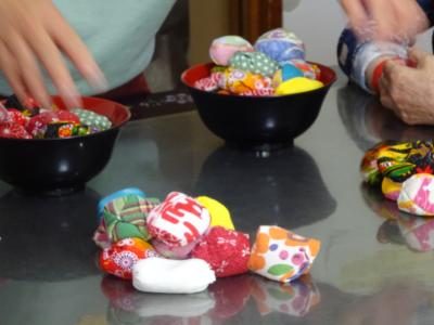 どんぶりにひとつずつ交代でお手玉を入れていきます。