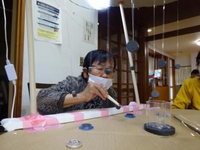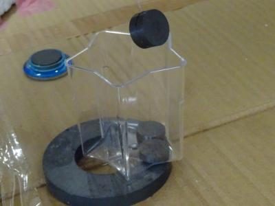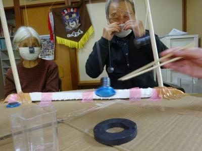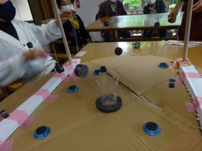 「磁石」にくっついてしまわないように、真ん中のカップに上手な落としてみましょう