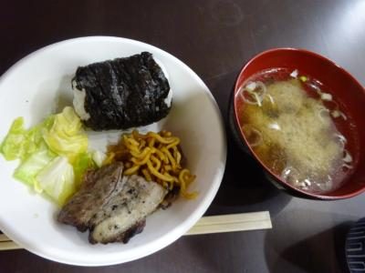 焼きそば、豚、鳥、牛肉、おにぎり、お漬物、豚汁
