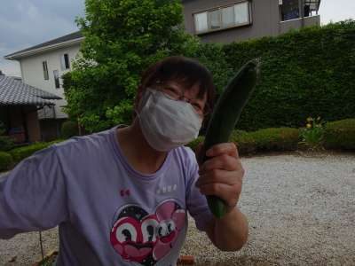 きゅうりを収穫できて、お母様大満足の笑顔ですわーい (嬉しい顔)ハートたち (複数ハート)ハートたち (複数ハート)