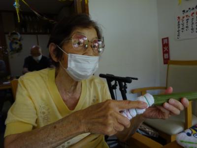 タオルが竹の棒に巻けましたら、輪ゴムで巻いていきます