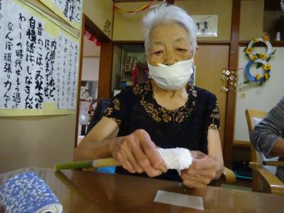 皆様には、竹の棒にタオルを巻いていただきます