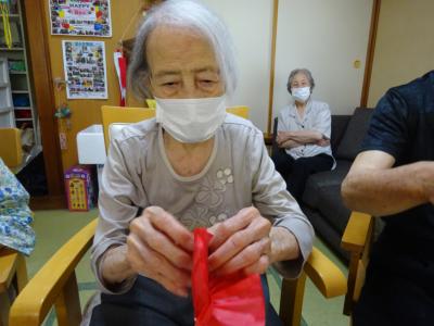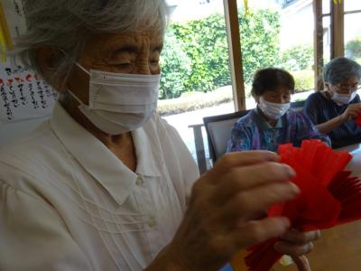 赤やピンク、青色の紙を広げて、お花を作っていきます