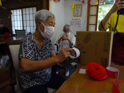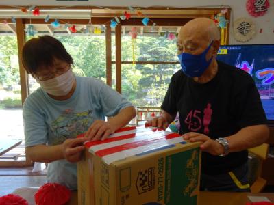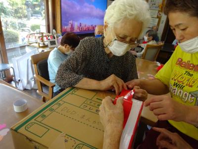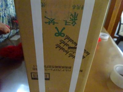 一番大きな段ボールは、紅白のテープを貼っていきます(‘◇’)ゞ