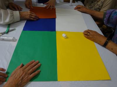 そうしましたら、模造紙を裏返して、画用紙を貼っていきます