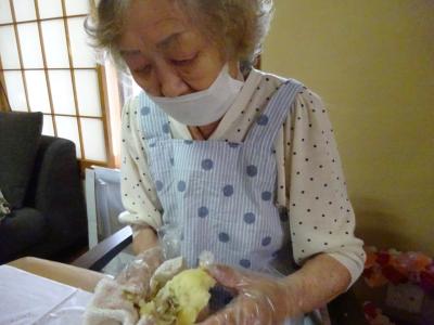 あつあつのじゃがいもに負けず、素早く皮を剥いていく