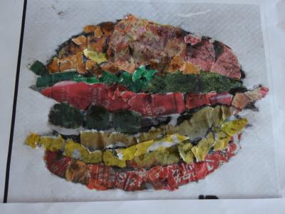 何を作っていらしゃるかと言うと、新聞の色が付いている所を、ちぎって頂いて「ハンバーガー」を作っていらしゃいます🍔
